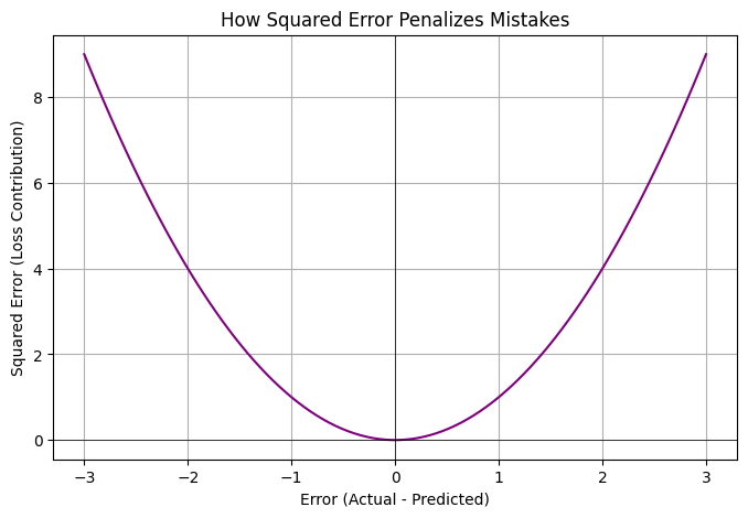 The first plot shows our predictions against the true values. The gray dotted lines represent the individual errors. MSE averages the square of these distances. The second plot clearly shows the parabolic (U-shaped) nature of squared error β small errors contribute a little to the loss, but as the error magnitude increases, the loss contribution shoots up dramatically! This makes the model really want to avoid those big deviations.