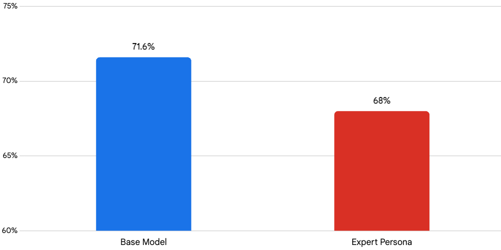 When that exact same model was forced to process those exact same questions through the lens of an expert persona, the accuracy consistently dropped to 68.0%.